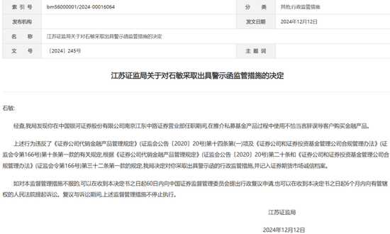 因此,江苏证监局决定对石敏采取出具警示函的行政监管措施,并记入证券期货市场诚信档案。