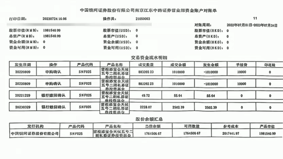 据了解,她通过银河证券南京江东中路证券营业部工作人员石敏购买了这款私募基金产品,认购约440.53万份基金份额。