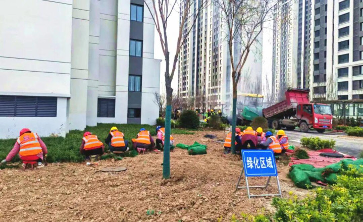 目前,项目正式水已接驳,现场50余名工人正在进行绿化、正式电室外线电缆、天然气室外施工等收尾工作。